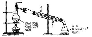 ①称取1.000g试样溶于少量水中,然后移至250mL容量瓶中,并加水稀释至刻度。准确移取25.0mL试液注入蒸馏烧瓶中,加3.00mL25%NaOH溶液,然后小火加热蒸馏。