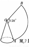 如图,有一圆心角为120 o、半径长为6cm的扇形,若将OA、OB重合后围成一圆锥侧面,那么圆锥的高是( )