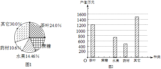 我省某地区结合本地自然条件,大力发展茶叶、蔗糖、水果、药材等产业,取得良好的经济效益,经过多年发展,茶叶、蔗糖、水果、药材成了该地区四大产业。图1、图2是根据该地区2006年各项产业统计资料绘制的两幅不完整统计图,请你根据统计图提供的信息解答以下问题: