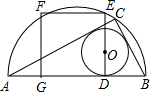 如图,AB为半圆的直径,C是半圆弧上一点,正方形DEFG的一边DG在直径AB上,另一边DE过ΔABC的内切圆圆心O,且点E在半圆弧上 .①若正方形的顶点F也在半圆弧上,则半圆的半径与正方形边长的比是______________;②若正方形DEFG的面积为100,且ΔABC的内切圆半径