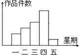 精英家教网为迎接学校艺术节,七年级某班进行班级歌词征集活动,作品上交时间为星期一至星期五.班委会把同学们上交作品件数按每天一组分组统计,绘制了频数分布直方图如下.已知从左至右各长方形的高的比为2:3:4:6:1,第二组的频数为9,则全班上交的作品有