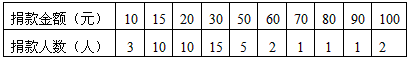 | 捐款金额(元) | 10 | 15 | 20 | 30 | 50 | 60 | 70 | 80 | 90 | 100 |