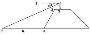 如图,张明站在河岸上的G点,看见河里有一只小船沿垂直于岸边的方向划过来,此时,他测得小船C的俯角是∠FDC=30°,若张明的眼睛与地面的距离是1.5米,BG=1米,BG平行于AC所在的直线,迎水坡的坡度i=4∶3,坡长AB=10米,求小船C到岸边的距离CA的长?(参考数据:
