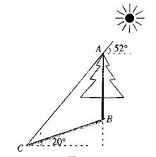 如图,在一个坡角为20º的斜坡上方有一棵树,高为AB,当太阳光线与水平线成52º角时,测得该树在斜坡上的树影BC的长为10m,求树高AB(精确到0.1m).