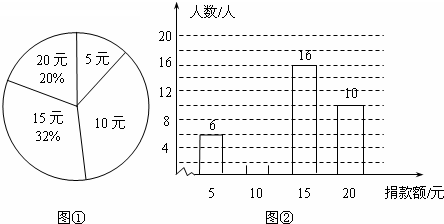 (2009•咸宁)在一次“爱心助学”捐款活动中,九(1)班同学人人拿出自己的零花钱,踊跃捐款,学生捐款额有5元、10元、15元、20元四种情况.根据统计数据绘制了图①和图②两幅尚不完整的统计图.