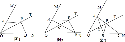 (3)若∠MON=60°,OB=2,射线AP交ON于点D,且满足且∠PBD=∠ABO,请借助图3补全图形,并求OP的长.