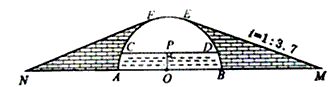 某河道上有一个半圆形的拱桥,河两岸筑有拦水堤坝,其半圆形桥洞的横截面如图所示.已知上、下桥的坡面线ME、NF与半圆相切,上、下桥斜面的坡度i=1∶3.7,桥下水深OP=5米,水面宽度CD=24米.设半圆的圆心为O,直径AB在坡角顶点M、N的连线上,求从M点上坡、过桥、下坡到N点的最短路径长.(参考数据:π≈3,