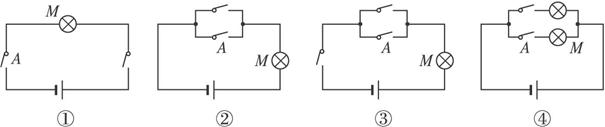 在以下四个电路图中,“闭合开关A”是“灯泡M亮”的充分不必要条件的是__________,必要不充分条件的是__________,充要条件的是__________,既不充分也不必要条件的是__________.