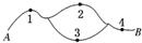 如图所示,在A,B间有四个焊接点,若焊接点脱落,则可能导致电路不通,今发现A,B之间线路不通,则焊接点脱落的不同情况有________种.