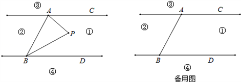 如图所示,直线AC∥BD,连接AB,直线AC、BD及线段AB把平面分成①、②、③、④四个部分,