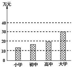 国家统计局最近公布的《首次中国城市居民家庭财产调查总报告》显示,截止2002年6月底,我国城市居民家庭财产总值平均每户为22.83万元。其中户主文化程度为小学、初中、高中、大学毕业的户均财产数值如上图所示: