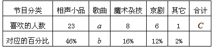 某校七年级(二)班学生为了解观众对2006年春节晚会节目安排的欢迎程度,对本班学生进行问卷调查(每人都必须且只能选一项最喜欢的节目),将数据收集整理后绘制出下面的统计表。
