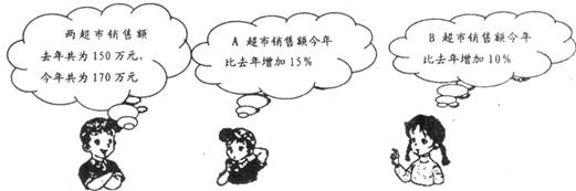 初三(2)班的一个综合实践活动小组去A,B两个超市调查去年和今年“五一节”期间的销售情况,下图是调查后小敏与其它两位同学进行交流的情景.根据他们的对话,请你分别求出A、B两个超市今年“五一节”期间的销售额。