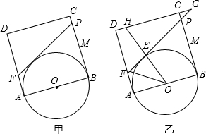 已知,如图(甲),正方形ABCD的边长为2,点M是BC的中点,P是线段MC上的一个动点,P不运动到M和C,以AB为直径做⊙O,过点P作⊙O的切线交AD于点F,切点为E.