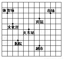 (3)请将体育场、宾馆和火车站看作三点用线段连起来,得△ABC,然后将此三角形向下平移4个单位长度,再画出平移后的△A/B/C/.(2分)