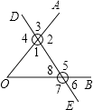 如图,直线DE与∠O的两边相交,则∠O的同位角是______,∠8的内错角是______,∠1的同旁内角是______,∠1的对顶角是______.