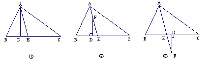 (2)在图②中,其他条件不变,若把“AD⊥BC于D”改为“F是AE上一点,FD⊥BC于D”,则∠DFE与∠B、∠C有何关系?试说明理由。