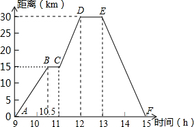 小强骑自行车去郊游,如图表示他离家的距离(km)与所用的时间x(h)之间关系的函数图象,小明9点离开家,15点回家,根据这个图象,请你回答下列问题:
