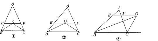 (1)如图①,△ABC中,AB=AC,∠B、∠C的平分线交于O点,过O点作EF∥BC交AB、AC于E、F。 (1) 若AC=15,则ΔAEF的周长为_______;
