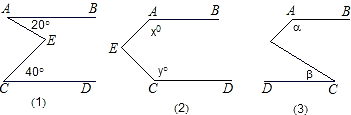 (3)如图③,若∠A= α,∠C= β,则α,β与∠AEC之间有何等量关系。并简要说明。