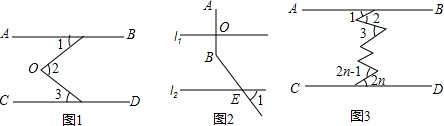 (3)如图3,AB∥CD,图中∠1,∠2,∠3,…,∠2n-1,∠2n之间有什么关系?(直接写出答案)