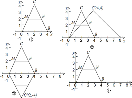 如图,在平面直角坐标系中,图①中的图案“A”中,O(0,0),B(4,0),C(2,4),M(1,2),N(3,2),图②和③都是由图①变换而得到: