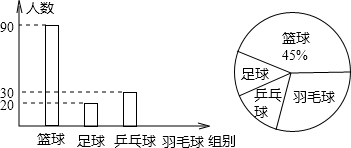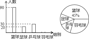 体育“2+1项目”是教育部为了落实《教育振兴行动计划》,落实德智体美全面发展的教育方针,推动学校体育和美育的改革与发展,逐步推进的一项重要工程项目.现对该活动中我校参加篮球、足球、乒乓球、羽毛球这四个项目的学生分布情况进行抽样调查,并根据收集的数据绘制了下面两幅不完整的统计图,请根据图中提供的信息,回答下面的问题: