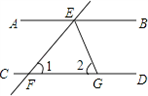 如图,直线EF分别交直线AB、CD于点E、F,EG平分∠BEF,若∠1 = 50°,∠2 = 65°,试判断直线AB与CD的位置关系,并说明理由。