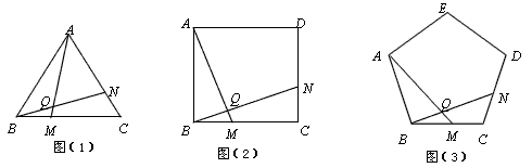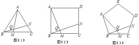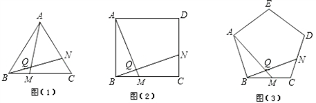 (3)如图(3),在正五边形ABCDE中,点M是BC上任一点,点N是边CD上任一点,且BM=CN,直线AM与BN相交于点Q,∠BQM等于多少度?