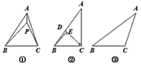 如图①,P为△ABC内一点,连接PA、PB、PC,在△PAB、△PBC和△PAC中,如果存在一个三角形与△ABC相似,那么就称P为△ABC的自相似点。