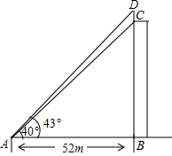 已知:如图,AB=52m,∠DAB=43°,∠CAB=40°,求大楼上的避雷针CD的长.(精确到0.01m)