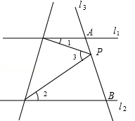 当点P在A、B两点之间时∠1+∠2+∠3=360°,当点P在l1上方时∠3=∠1-∠2,当点P在l2下方时∠3=∠2-∠1.