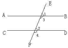 AB、CD、EF均为直线,其中∠3=∠4,试用简单理由说明∠1=∠2。