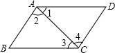 如图,要得到AB∥CD,只需要添加一个条件,这个条件可以是(      )。(填一个你认为正确的条件即可)