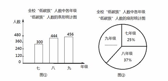 (2)小丽依据图①、图②提供的信息通过计算认为,与其他两个年级相比,九年级的“低碳族”人数在本年级全体学生中所占的比例较大,你认为小丽的判断正确吗?说明理由。