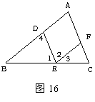 如图16,点D、E、F分别在AB、BC、AC上,且DE∥AC,EF∥AB,下面写出了说明“∠A+∠B+∠C=180°”的过程,请填空: