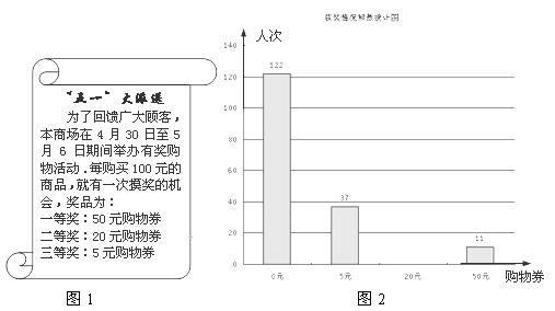 “五一”期间,新华商场贴出促销海报,内容如图1.在商场活动期间,王莉和同组同学随机调查了部分参与活动的顾客,统计了200人次的摸奖情况,绘制成如图2的频数分布直方图.