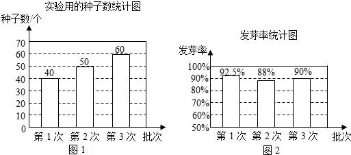 在课外科学活动中,小明同学在相同条件下分3次做了某种作物种子发芽的实验,每次所用的种子数、每次的发芽率(发芽率=数学公式×100%)分别如图1,图2所示: