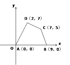 如图所示的直角坐标系中,四边形的四个顶点坐标分别是A(0,0)、B(9,0)、C(7,5)、D(2,7),求这个四边形的面积.![]()