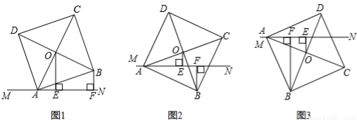 (1)如图1,当O、B两点均在直线MN上方时,易证:AF+BF=2OE(不需证明)