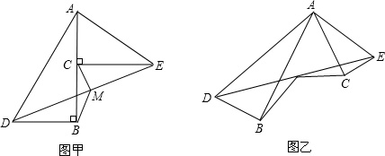 已知:△ABD和△ACE都是直角三角形,且∠ABD=∠ACE=90°.如图甲,连接DE,设M为DE的中点.