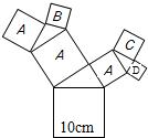 精英家教网如图,所有的四边形都是正方形,所有的三角形都是直角三角形,其中最大的正方形的边长为10cm,正方形A的边长为6cm,B的边长为5cm,C的边长为5cm,则正方形D的边长为(  )