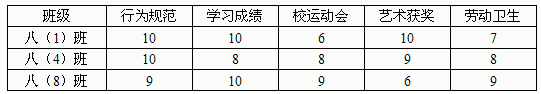 | 某学校对初中毕业班经过初步比较后,决定从九年级(1)、(4)、(8)班这三个班中推荐一个班为市级先进班集体的候选班,现对这三个班进行综合素质考评,下表是它们五项素质考评的得分表:(以分为单位,每项满分为10分) | ||||||||||||||||||||||||