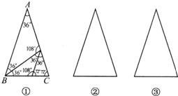 已知△ABC中,AB=AC,∠A=36°,仿照图①,请你再设计两种不同的分法,将△ABC分割成3个三角形,使得每个三角形都是等腰三角形.