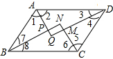 如图所示,平行四边形ABCD中,AQ、BN、CN、DQ分别是∠DAB、∠ABC、∠BCD、∠CDA的平分线,AQ与BN交于P,CN与DQ交于M,在不添加其它条件的情况下,试写出一个由上述条件推出的结论,并给出证明过程(要求:推理过程中要用到“平行四边形”和“角平分线”这两个条件).