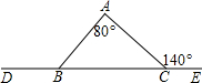 如图,∠BAC=80°,∠ACE=140°,则∠ABD=________度.