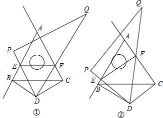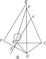 如图,点D是等边△ABC外一点,且DB=DC,∠BDC=120°,将一个三角尺60°的顶点放在点D上,三角尺的两边DP、DQ分别与射线AB、CA相交于E、F两点.
