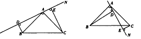 (2)若将直线AN绕A点沿顺时针方向旋转,使它经过△ABC的内部,再作BD⊥AN于D,CE⊥AN于E,那么DE、DB、CE之间还存在等量关系吗?若存在,请证明你的结论。