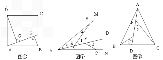 感知:如图①,点E在正方形ABCD的边BC上,BF⊥AE于点F,DG⊥AE于点G,可知△ADG ≌△BAF ;(不要求证明) 拓展:如图②,点B 、C 分别在∠MAN 的边AM 、AN 上,点E 、F 在∠MAN 内部的射线AD 上,∠1 、∠2 分别是△ABE 、△CAF 的外角,已知AB=AC ,∠1= ∠2= ∠BAC ,求证:△ABE ≌△CAF .