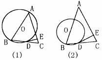 (2)若O沿AB向点B移动,以O为圆心,OB为半径的圆仍交BC于点D,DE⊥AC于点E, AB=AC不变,如图(2)所示,那么(1)的结论还成立吗?若成立,则给予证明;若不成立,请说明理由。